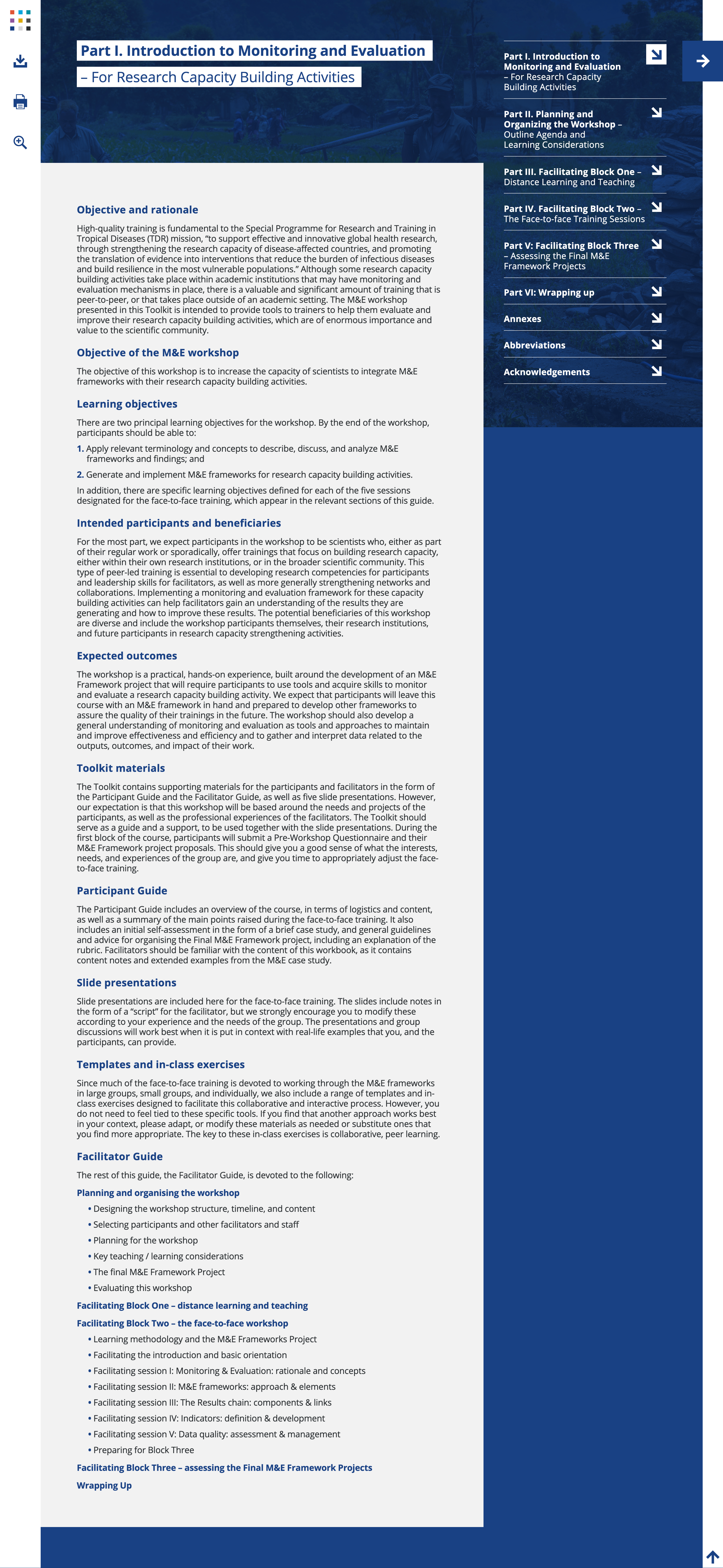 High-quality training is fundamental to the Special Programme for Research and Training in Tropical Diseases (TDR) mission, “to support effective and innovative global health research, through strengthening the research capacity of disease-affected countries, and promoting the translation of evidence into interventions that reduce the burden of infectious diseases and build resilience in the most vulnerable populations.” Although some research capacity building activities take place within academic institutions that may have monitoring and evaluation mechanisms in place, there is a valuable and significant amount of training that is peer-to-peer, or that takes place outside of an academic setting. The M&E workshop presented in this Toolkit is intended to provide tools to trainers to help them evaluate and improve their research capacity building activities, which are of enormous importance and value to the scientific community.