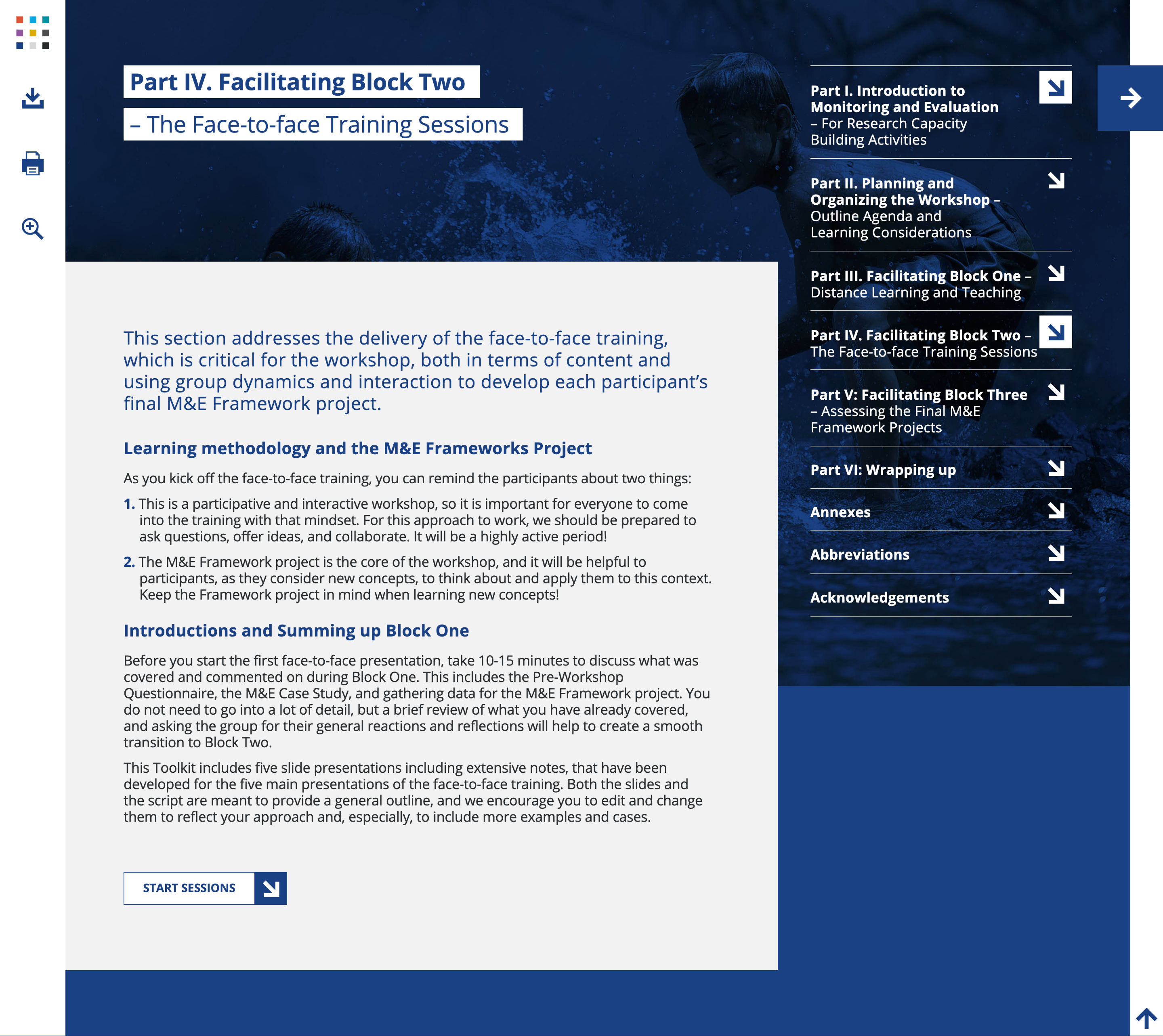 This section addresses the delivery of the face-to-face training, which is critical for the workshop, both in terms of content and using group dynamics and interaction to develop each participant’s final M&E Framework project.