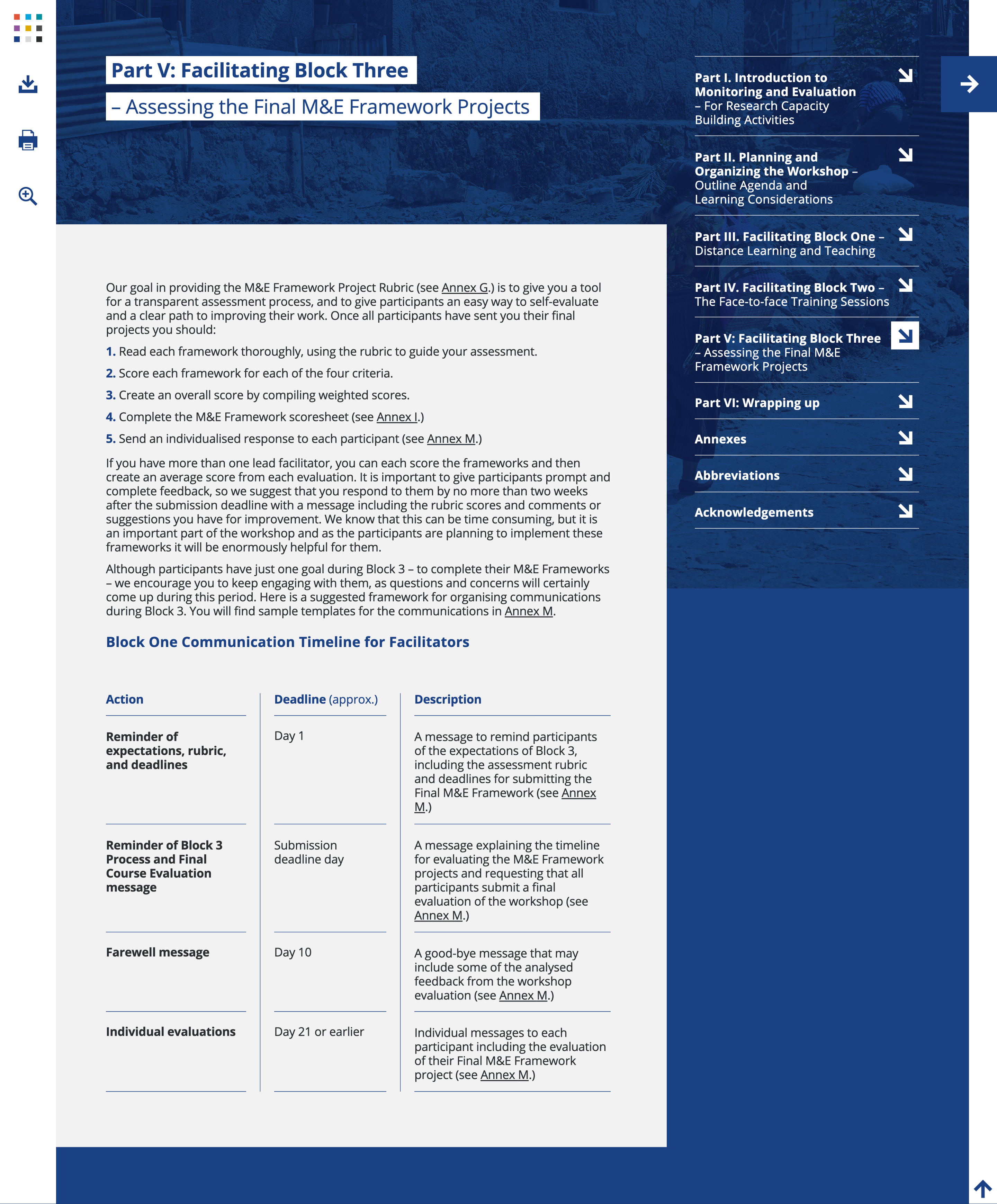 A message to remind participants of the expectations of Block 3, including the assessment rubric and deadlines for submitting the Final M&E Framework (see Annex M.)