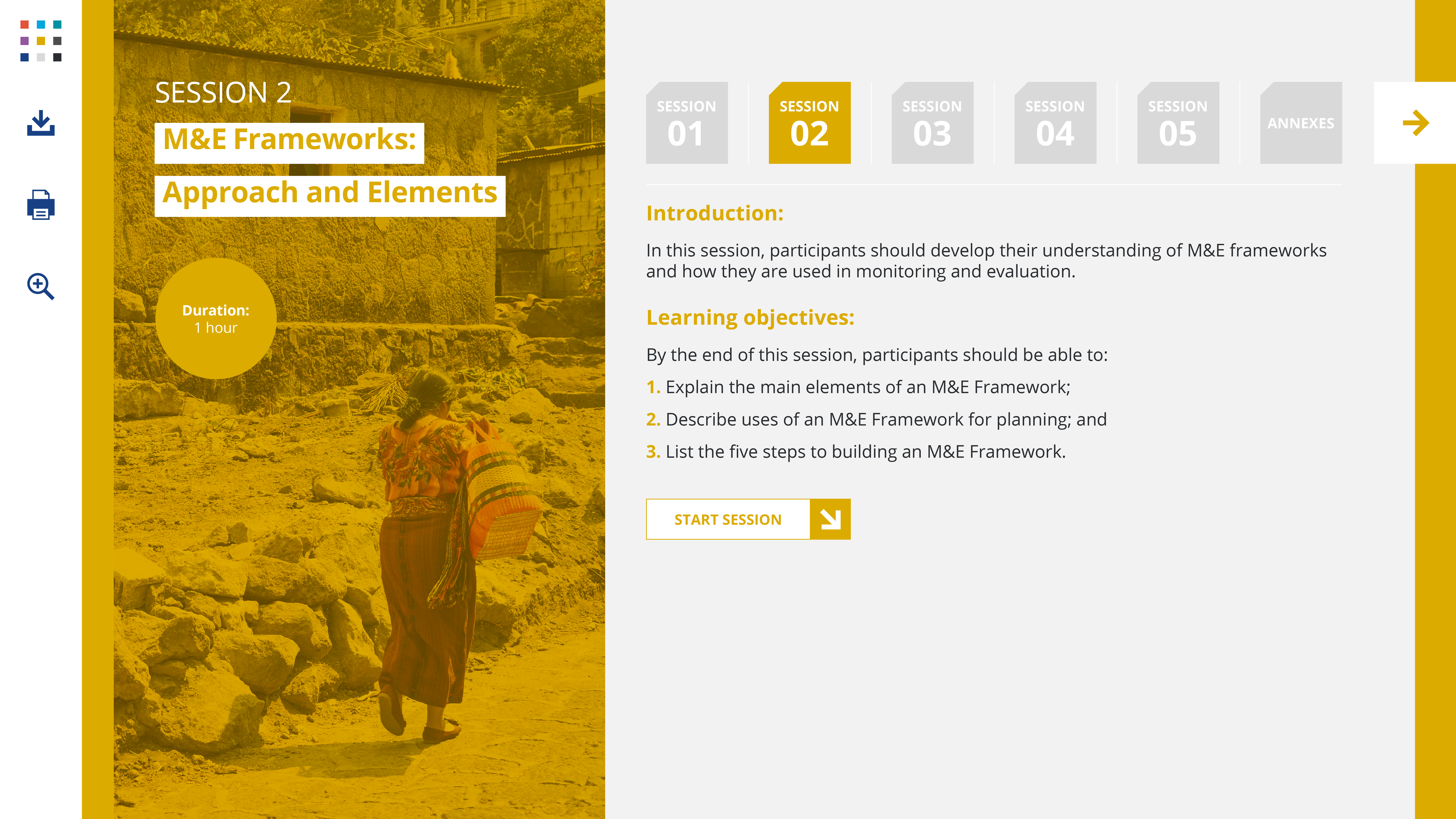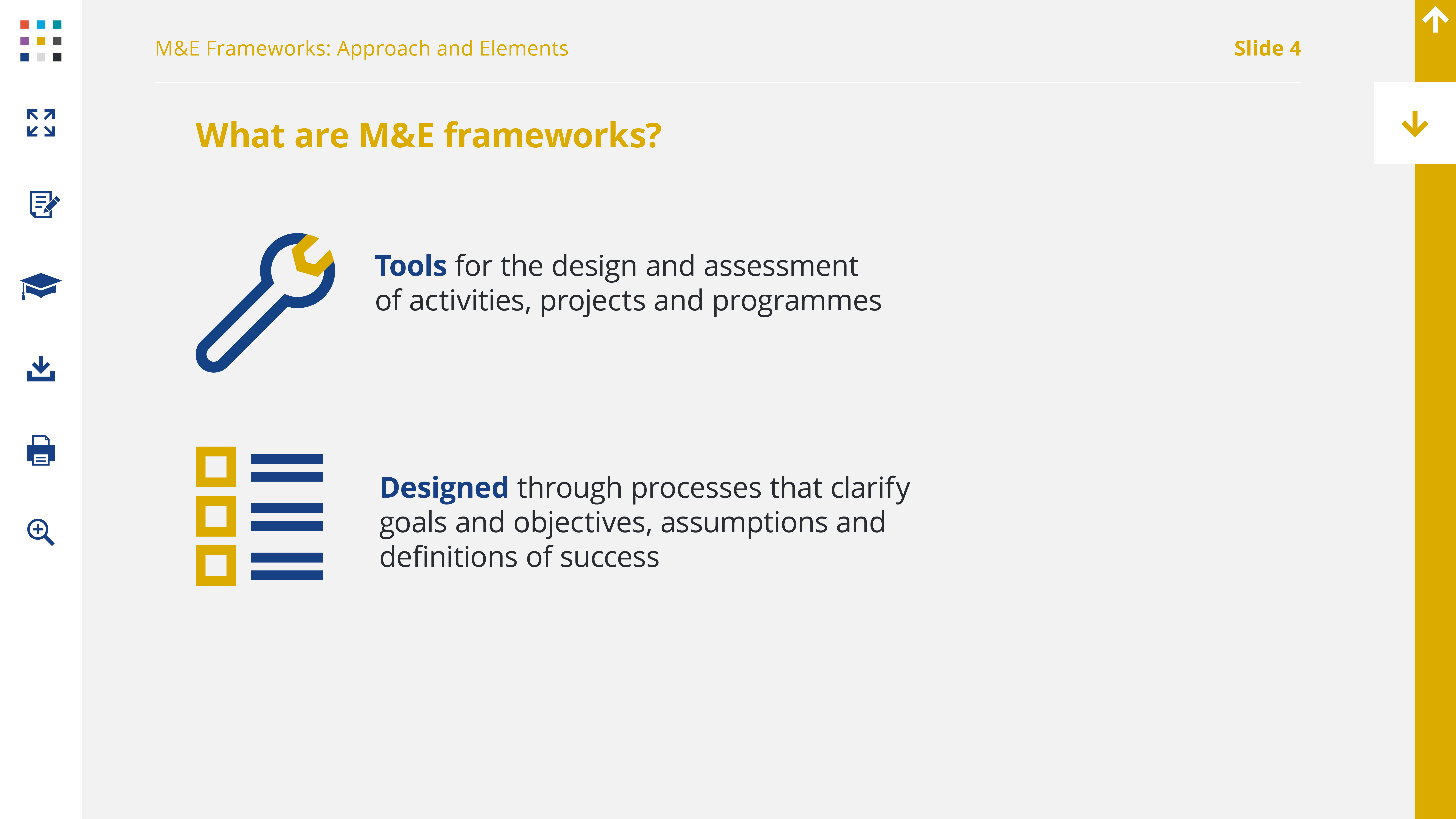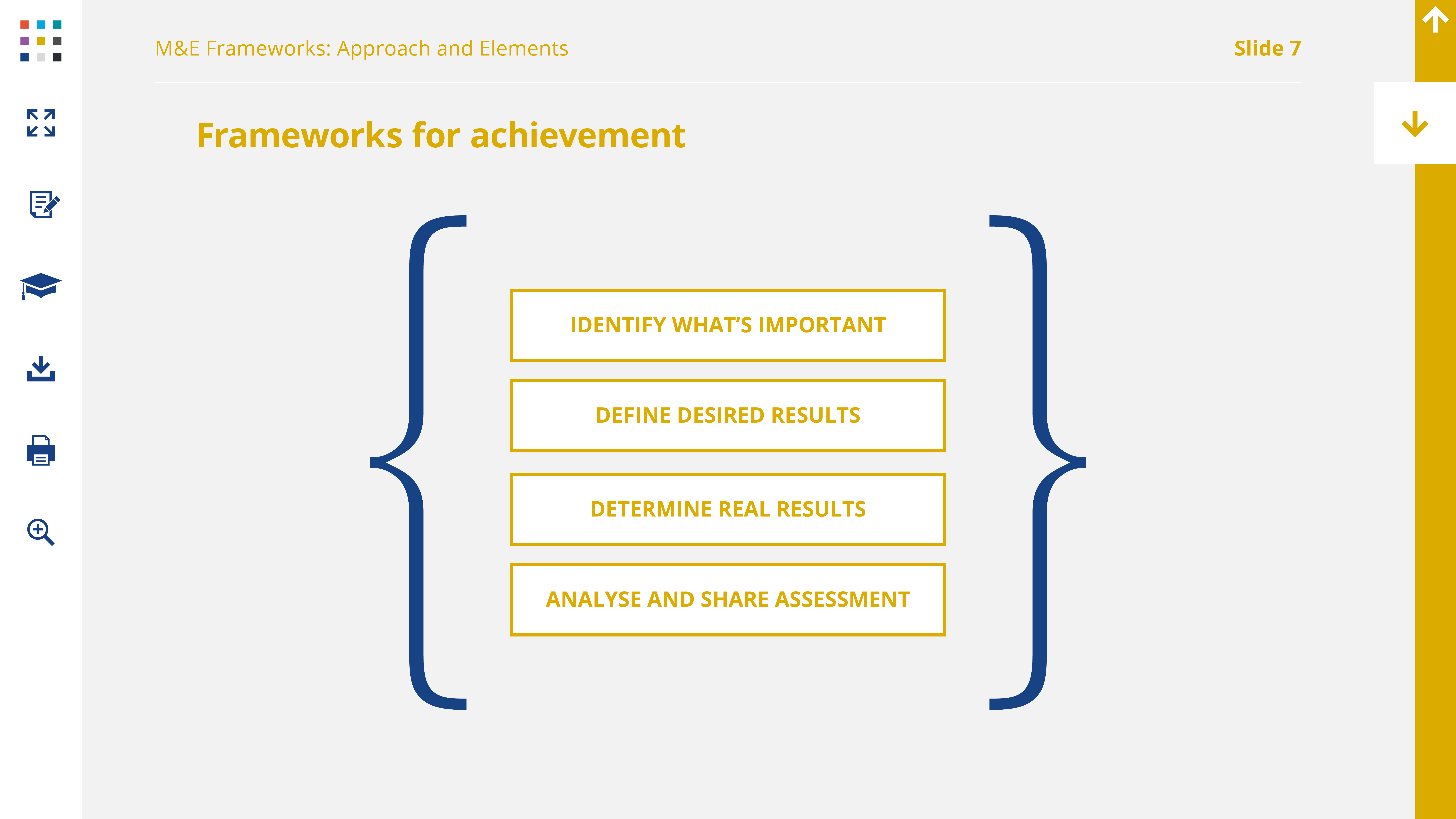 The approach to M&E that we adopt in the context of this workshop is the Results Framework, so when we refer to M&E frameworks, that’s what we mean.