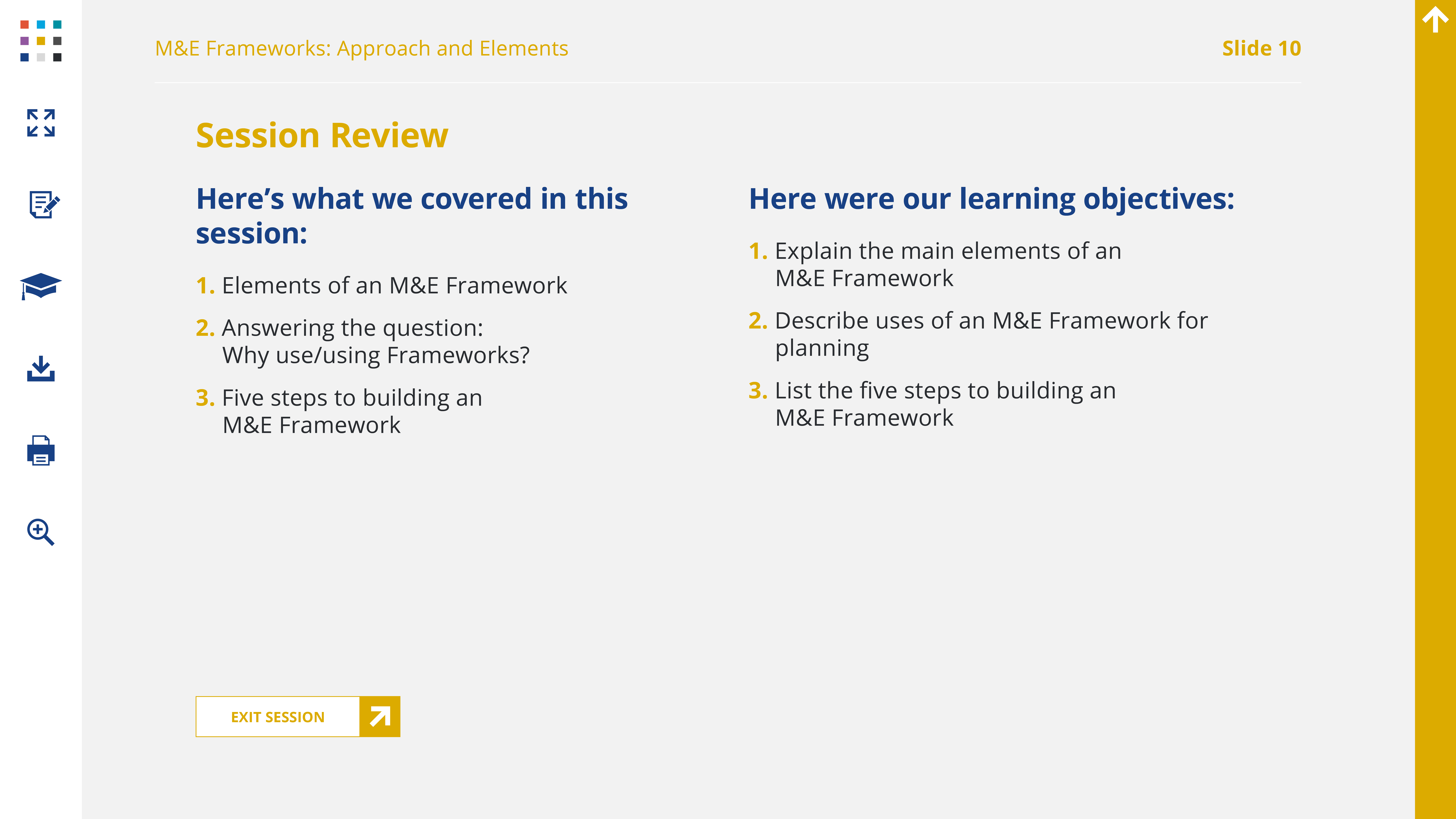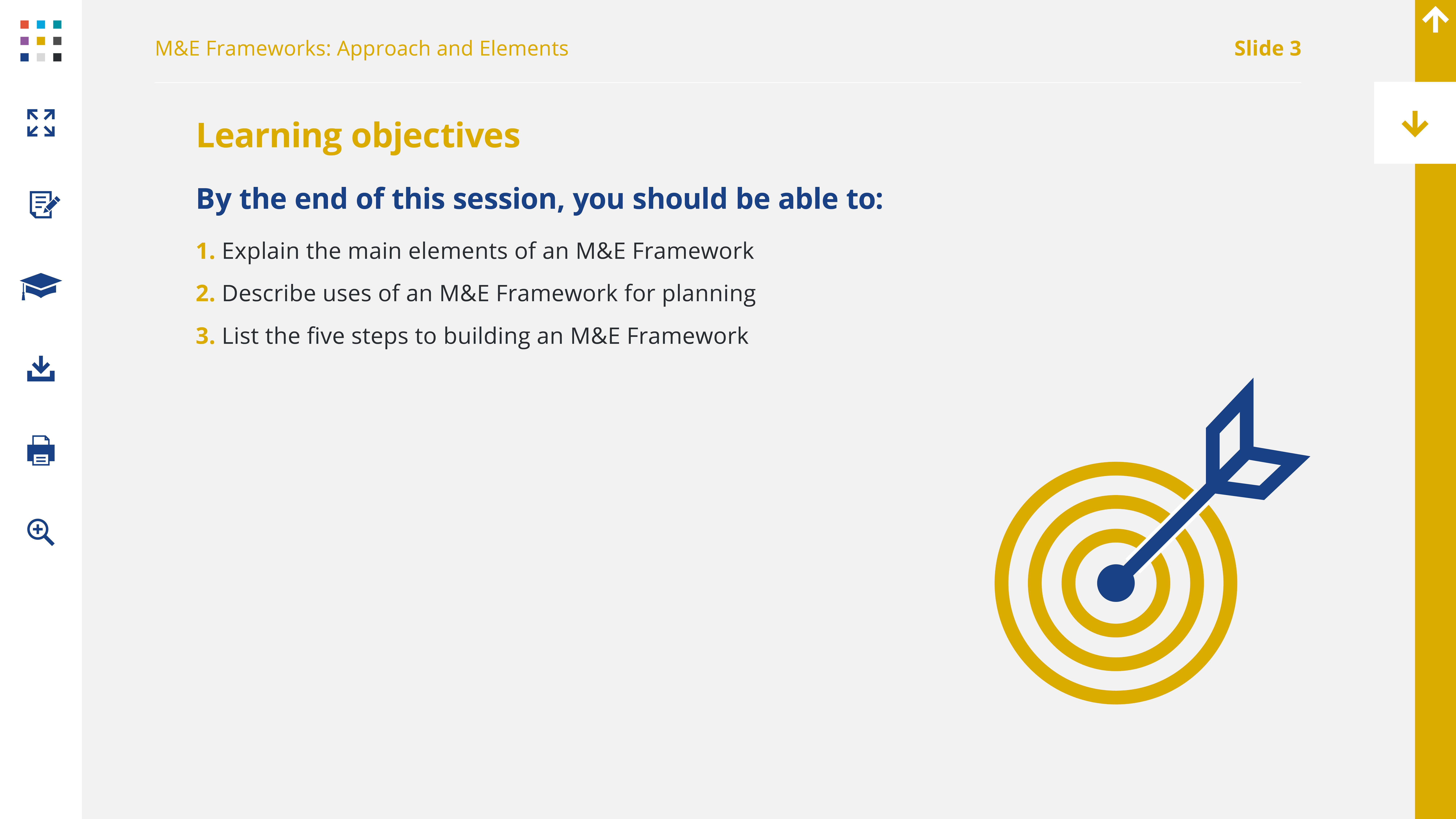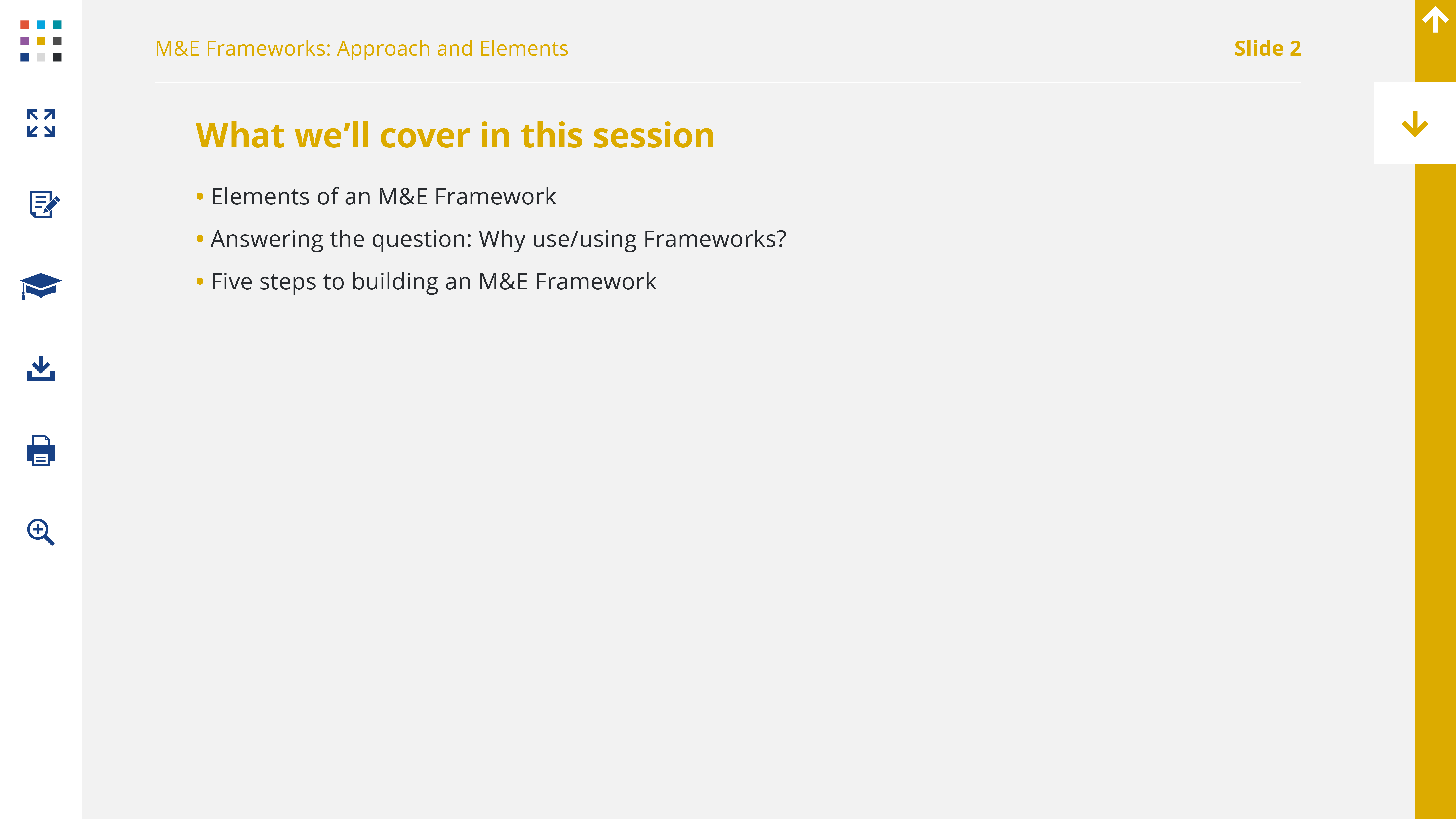 The scope of this workshop only allows us to cover an M&E framework, but it’s important to know that, ideally, this framework will be situated within an M&E Plan. These are the principal components of an M&E Plan. When you think about implementing an M&E approach at your institution, you should consider developing a full M&E Plan, in addition to the Framework you will work on here.