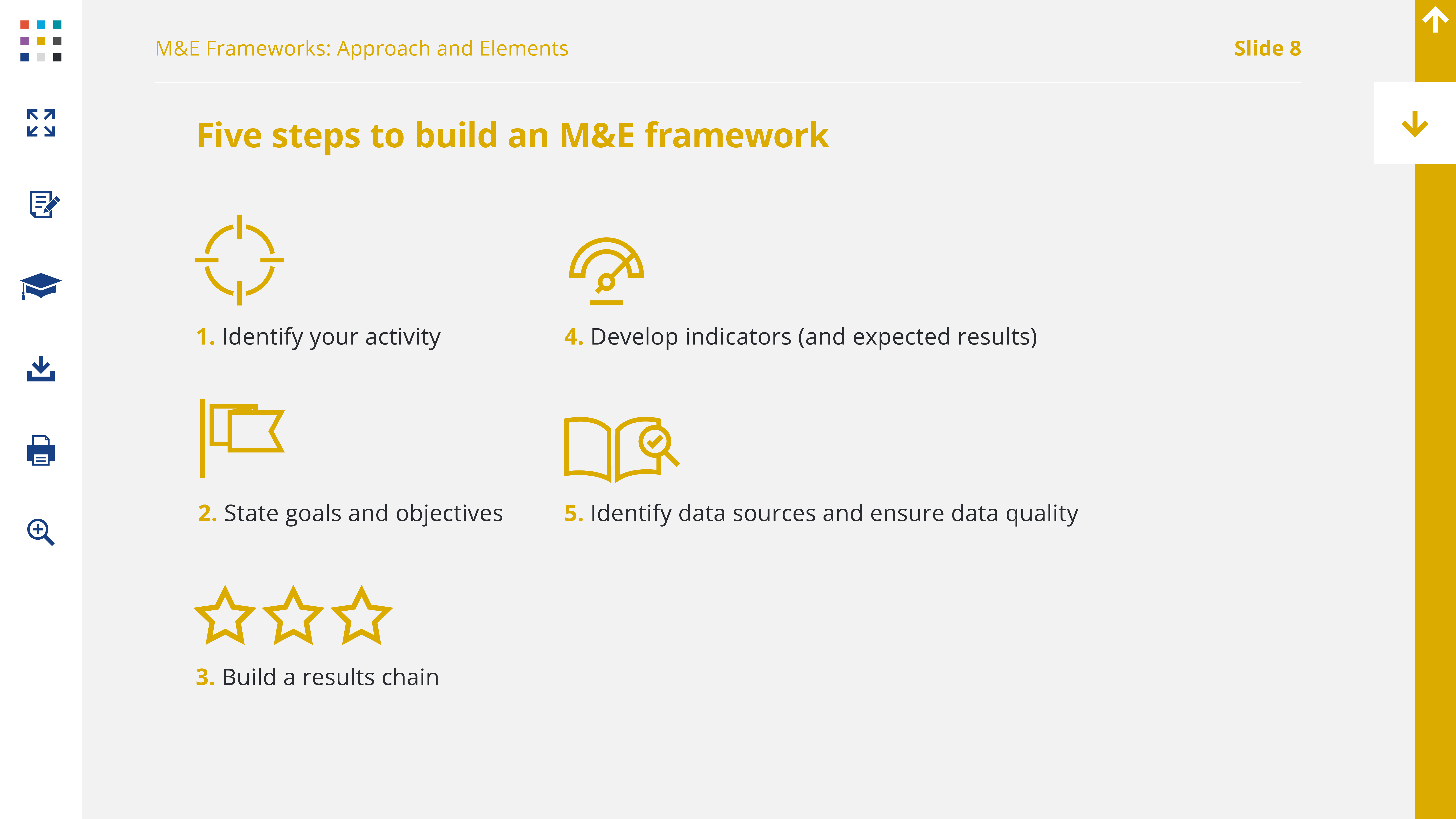 Here are the five steps that you will take to develop your M&E framework. You’ll see that you’ve already taken the first two steps. However, it’s important to know that as you go through the process of designing your Framework you may want or need to go back, reconsider or revise your activity, or the goals and objectives it’s aligned with.