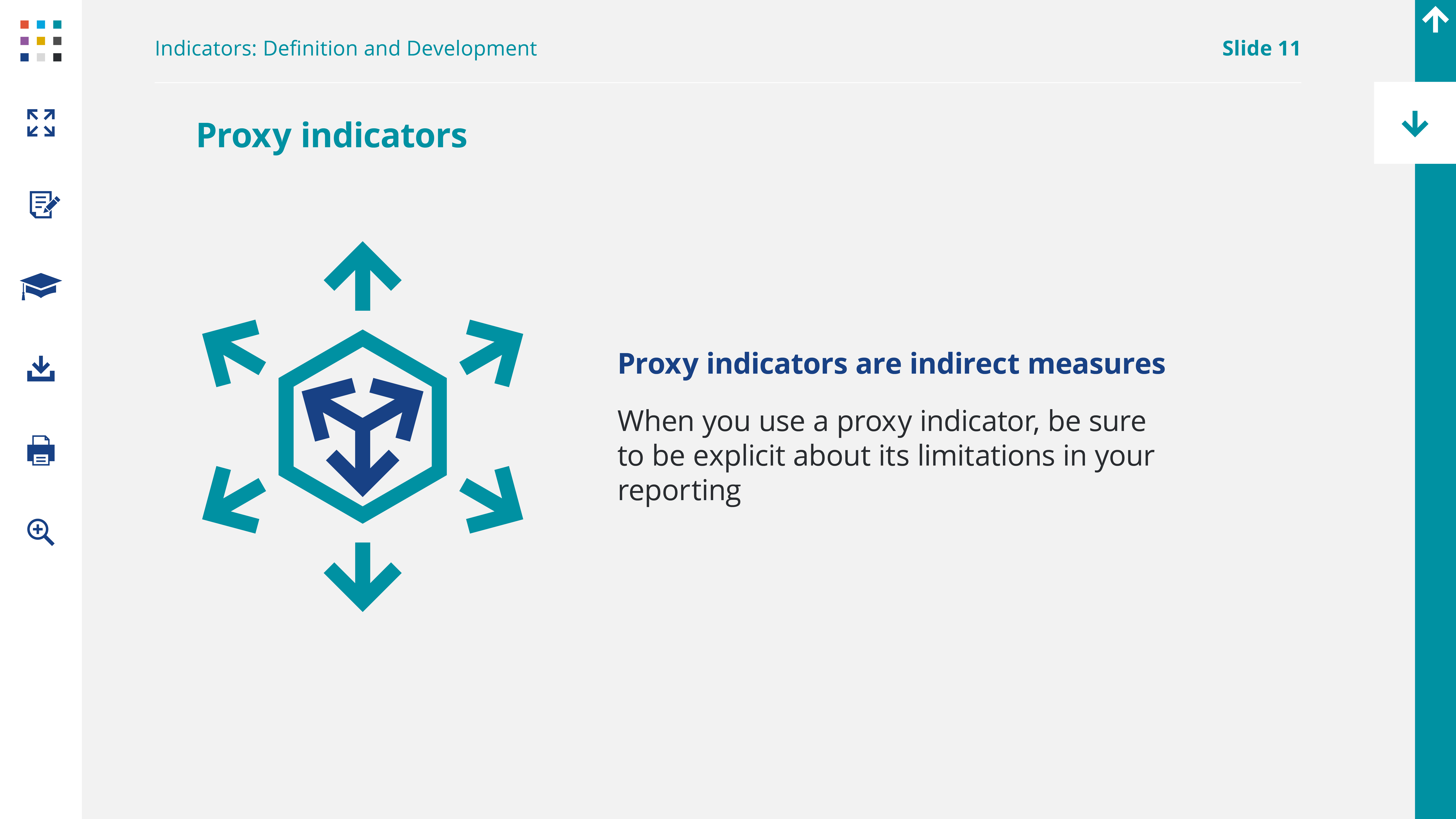 A proxy indicator is an indirect measure that we use to get data that is indicative of the desired result. For any proxy measure, it will be important to reiterate the measurement and its possible limitations, and to account for this limitation as data moves through your M&E system: from collection, to aggregation, and to use.