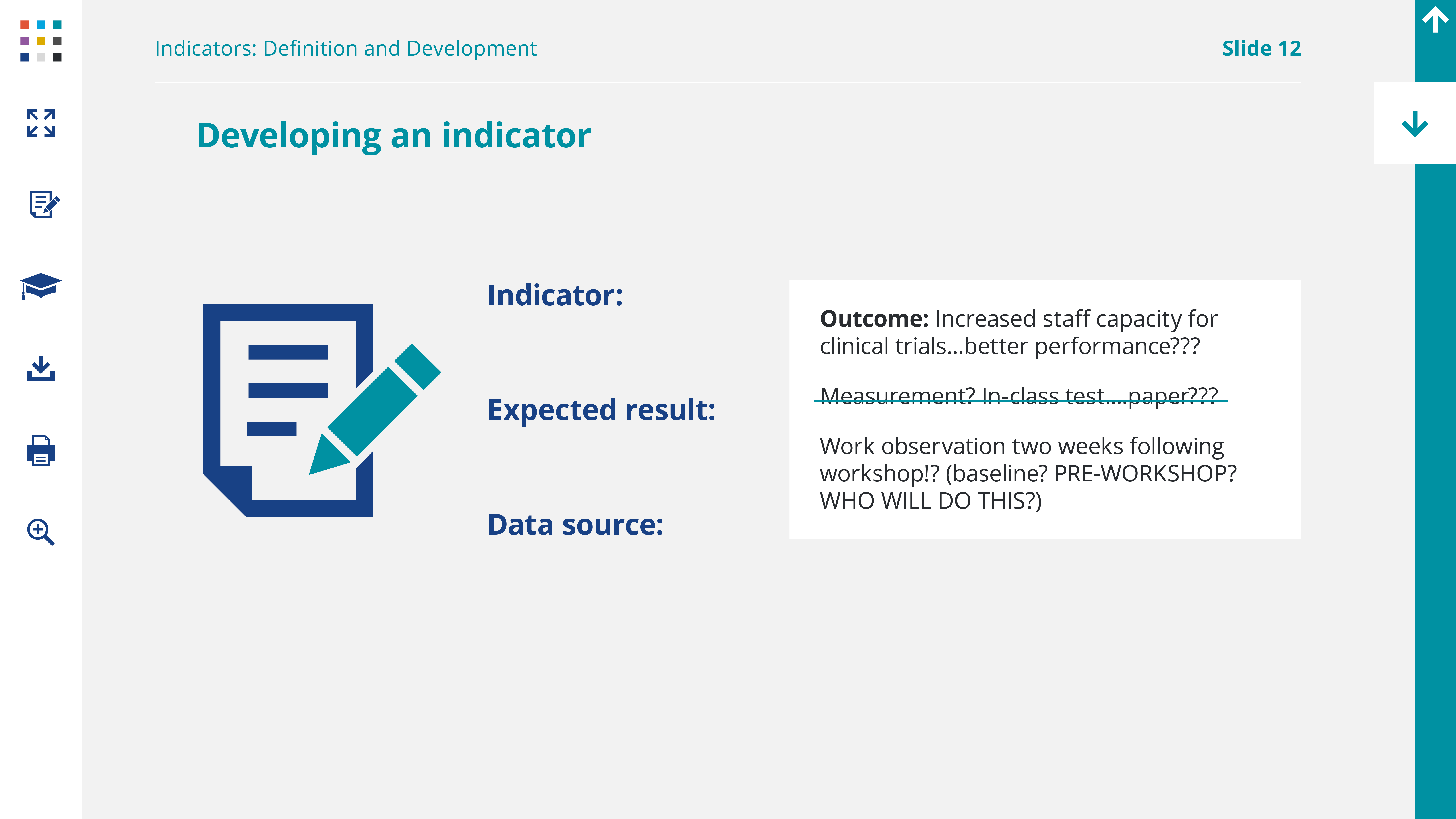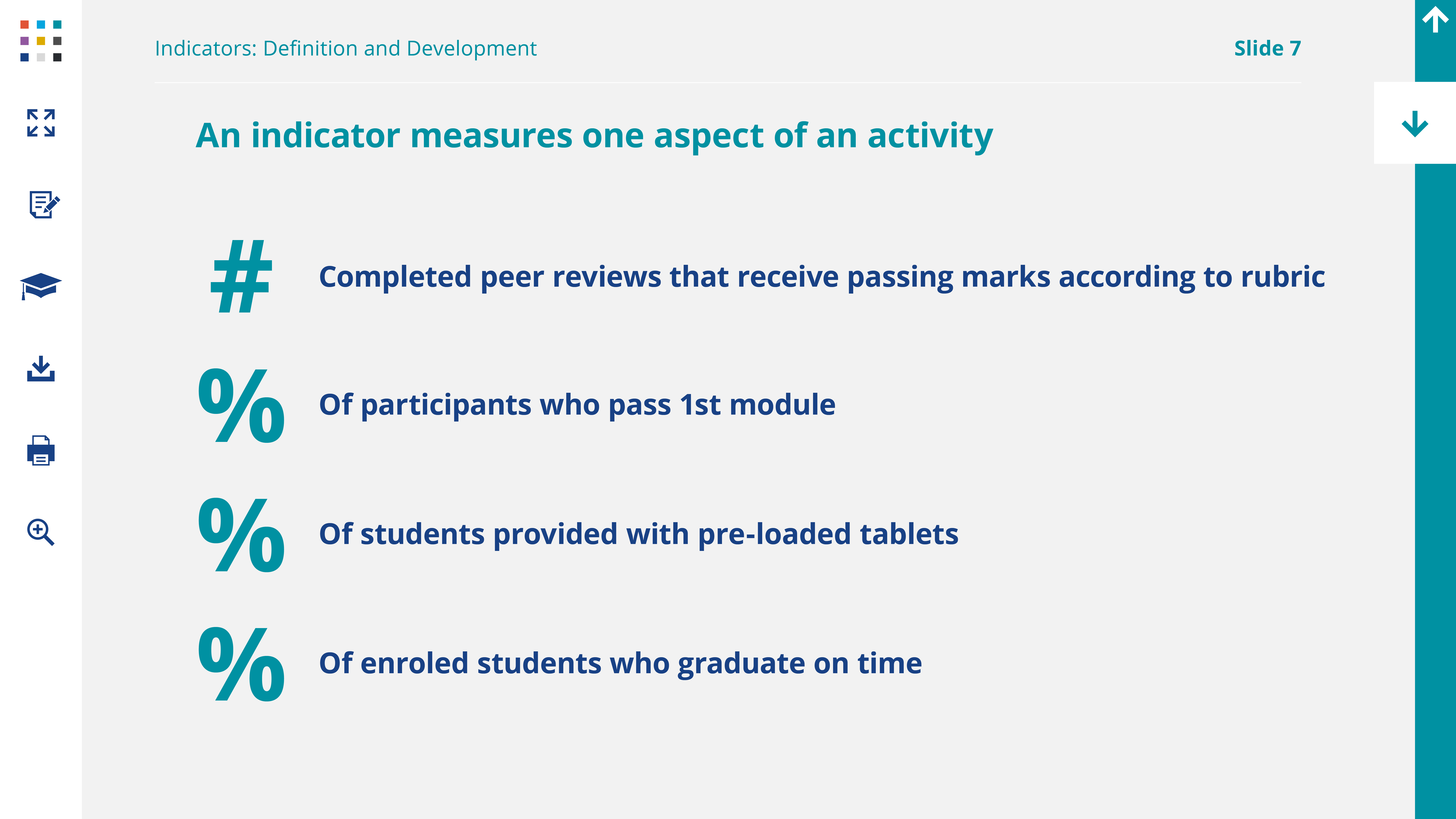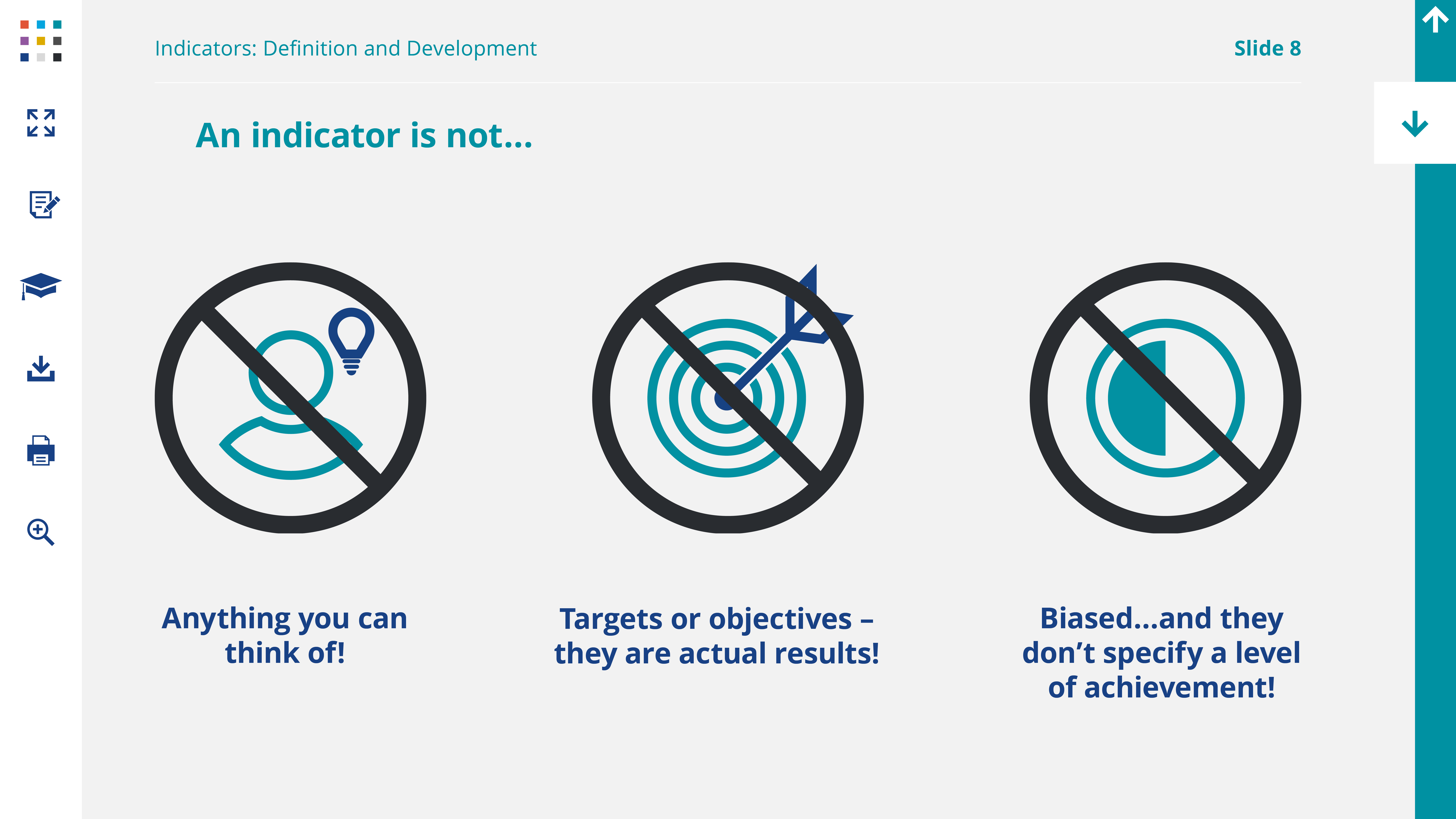 Indicators are not objectives or targets, but actual results. For example, 12 students graduating from a course, is not an indicator. Why? What would the indicator be in this case? Why is “12 students” not the indicator?