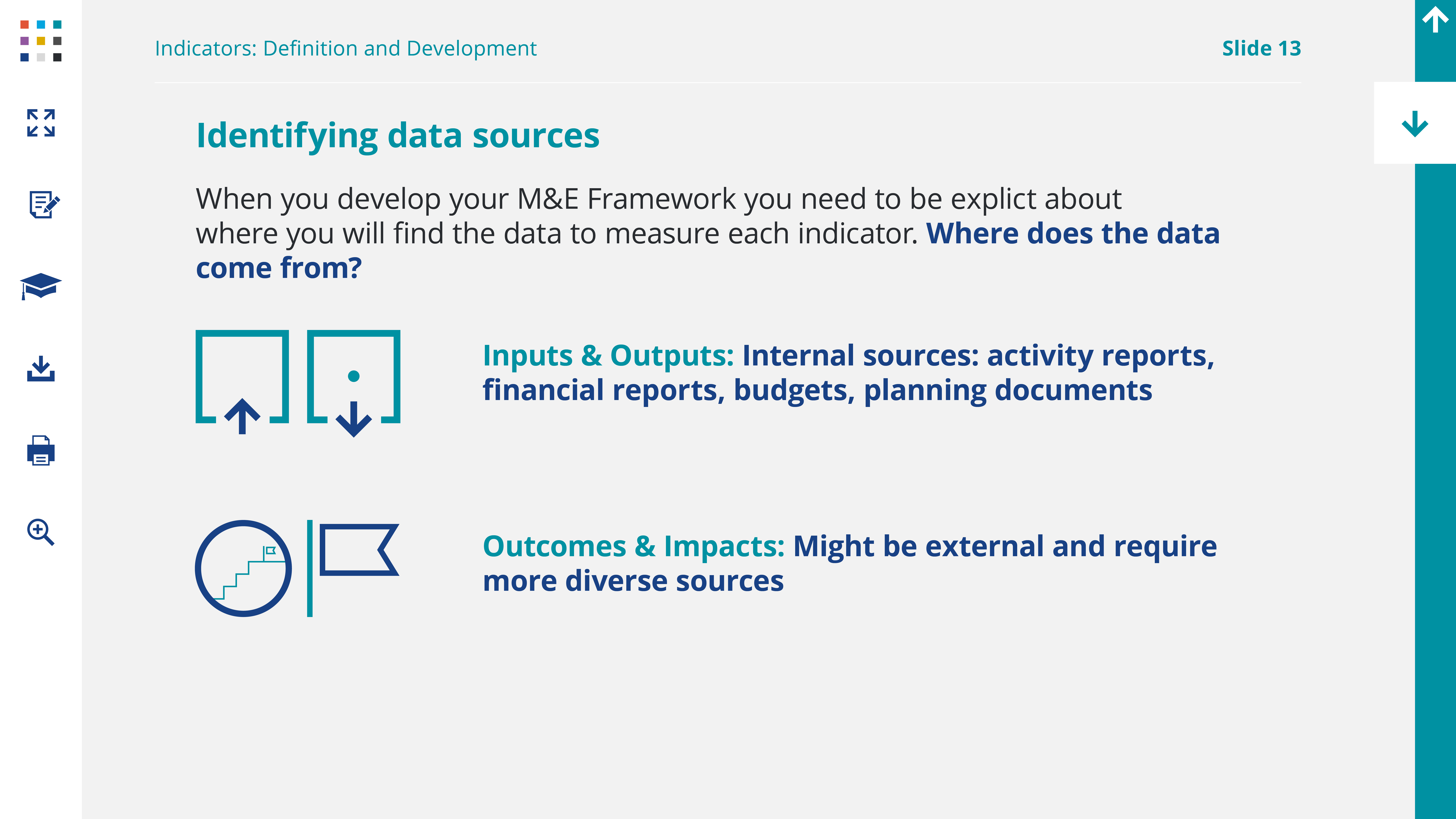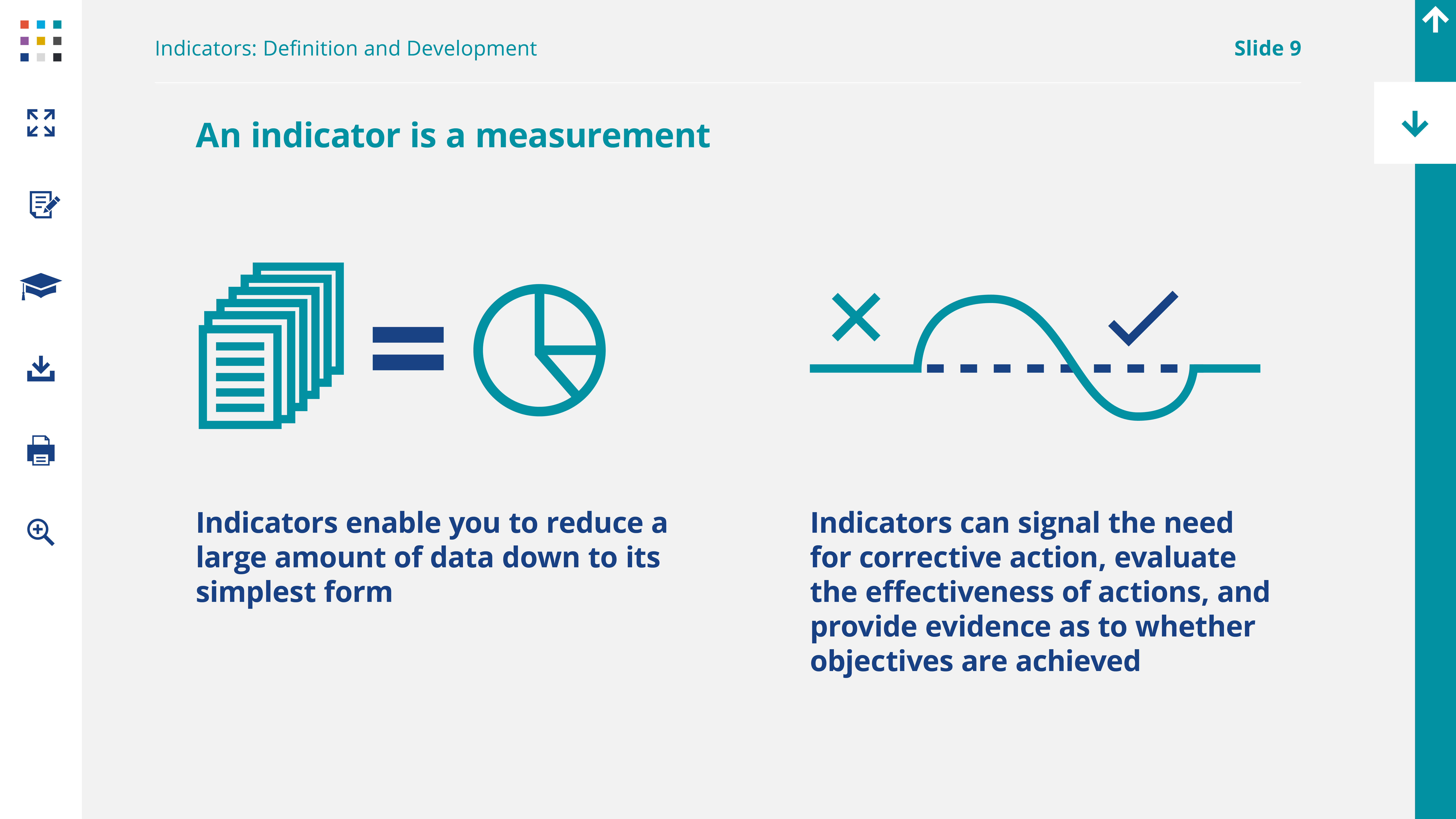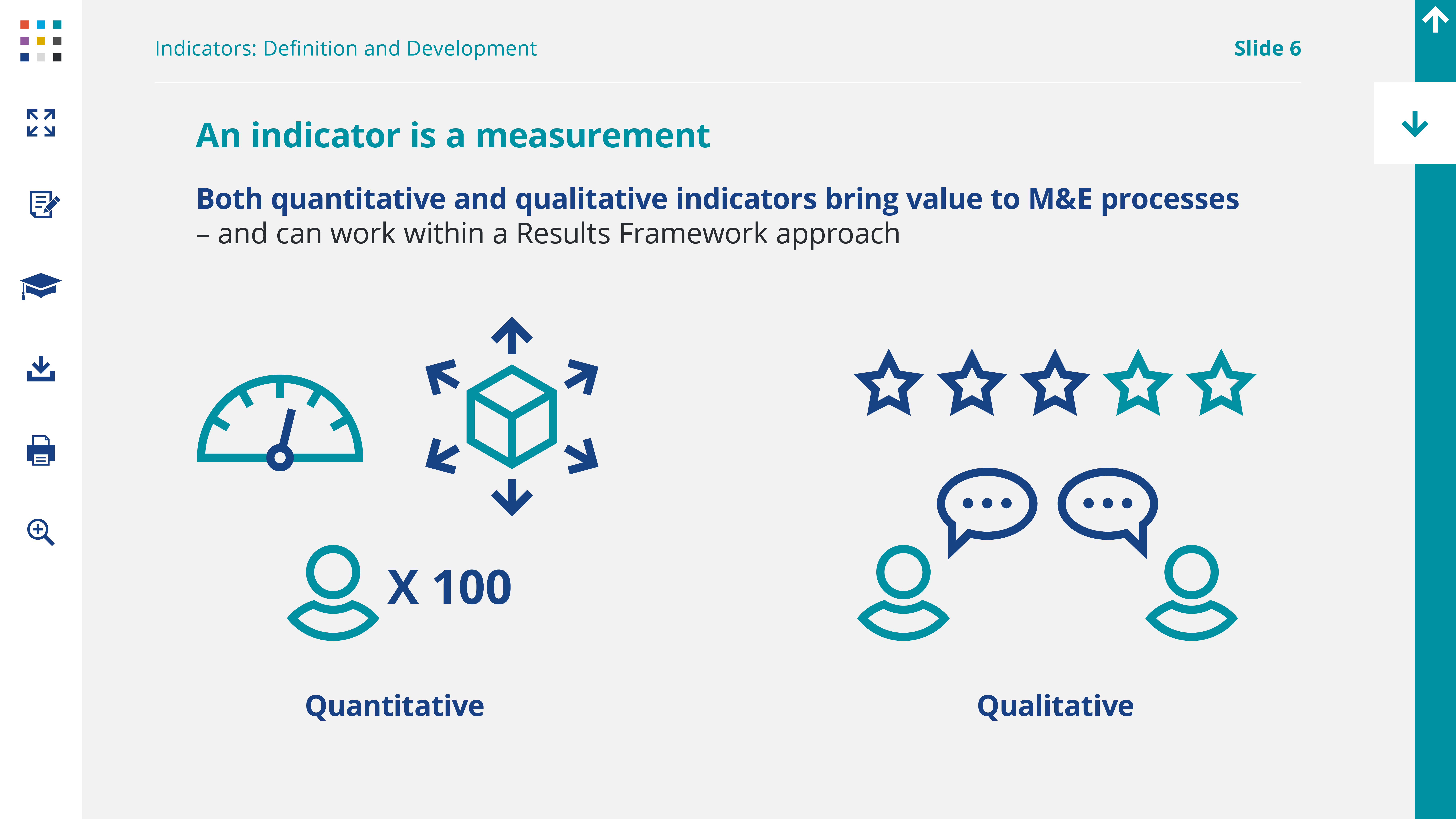 Indicators are where data enter our M&E system. They help us to see what we have done and to put it in measurable terms. And they can help us to manage a lot of data and make it understandable and useful. Once this information is placed back into the context of your activities and programmes, it can then be used to check progress and inform future decision making.