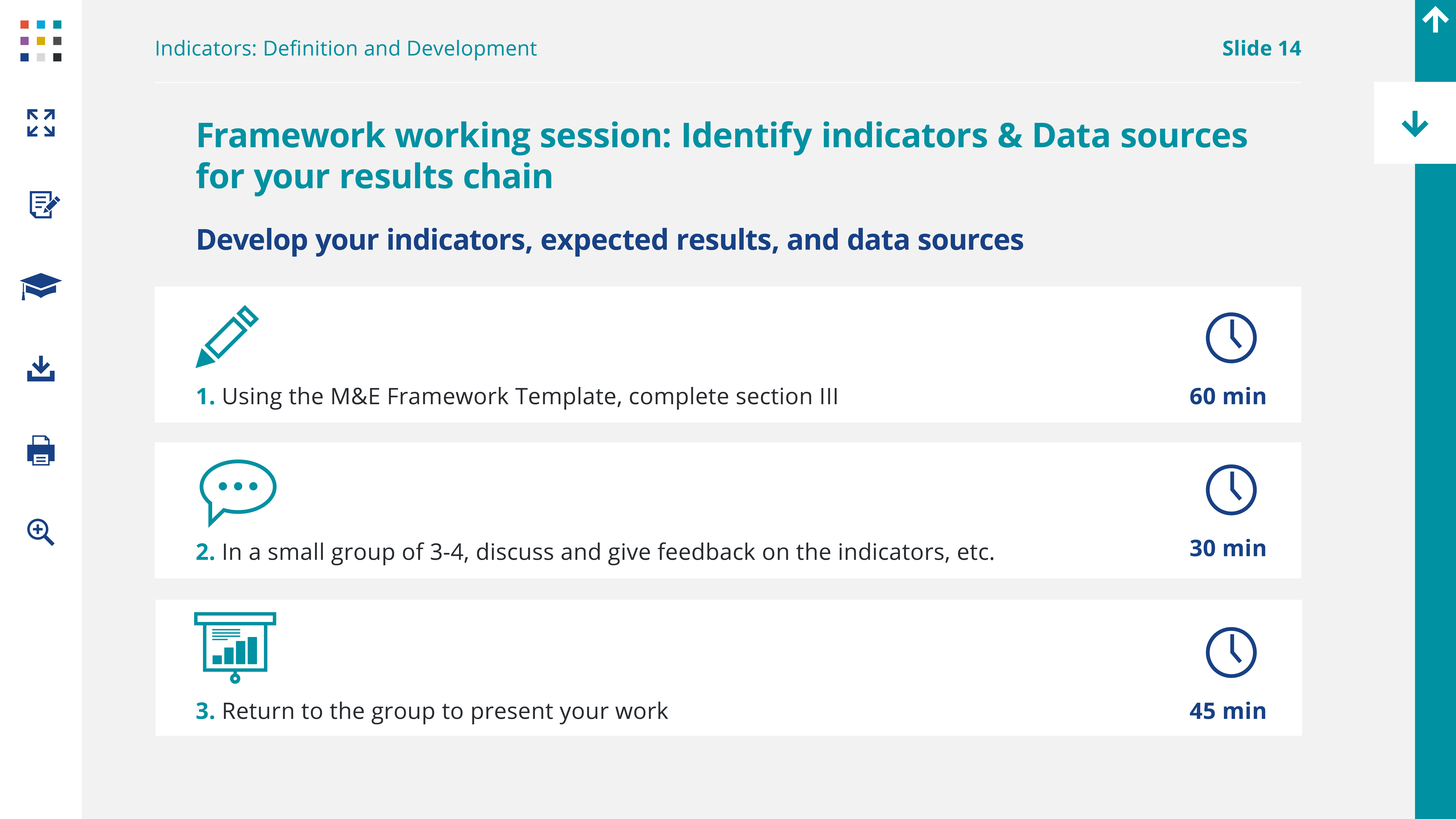 Now it’s time to get back into your M&E frameworks. You’ll have an hour in this session to review your work so far and then complete, or at least move forward with, section 3. You’ll need to create indicators, establish your expected results, and identify your data sources here.
